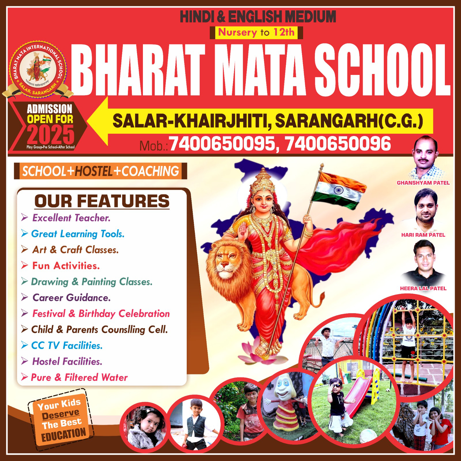 Bharat Mata Higher Secondary School, Salar, District Sarangarh-Bilaigarh (C.G.), was established in the academic year 2025–26 with a vision to provide quality, value-based education to children from all sections of society. The school is affiliated with the Central Board of Secondary Education (CBSE), New Delhi (Affiliation No. 330561). It also houses an English-medium middle school located in the Industrial Area, Sarangarh, ensuring accessibility to a wider community.
