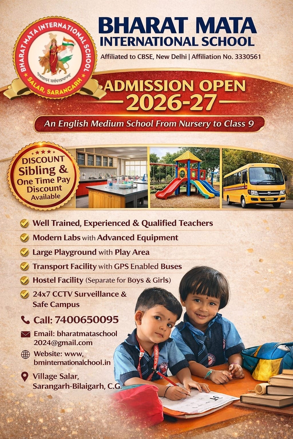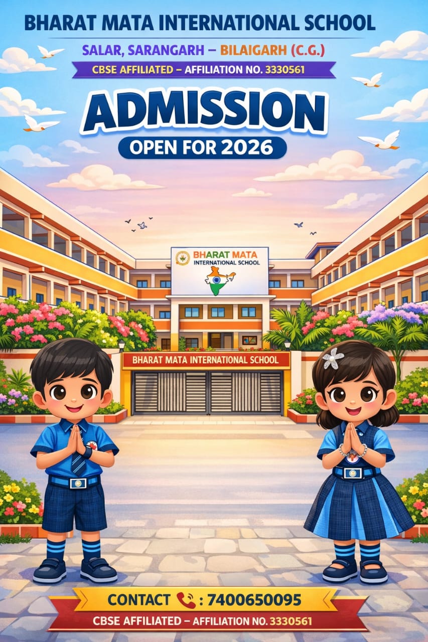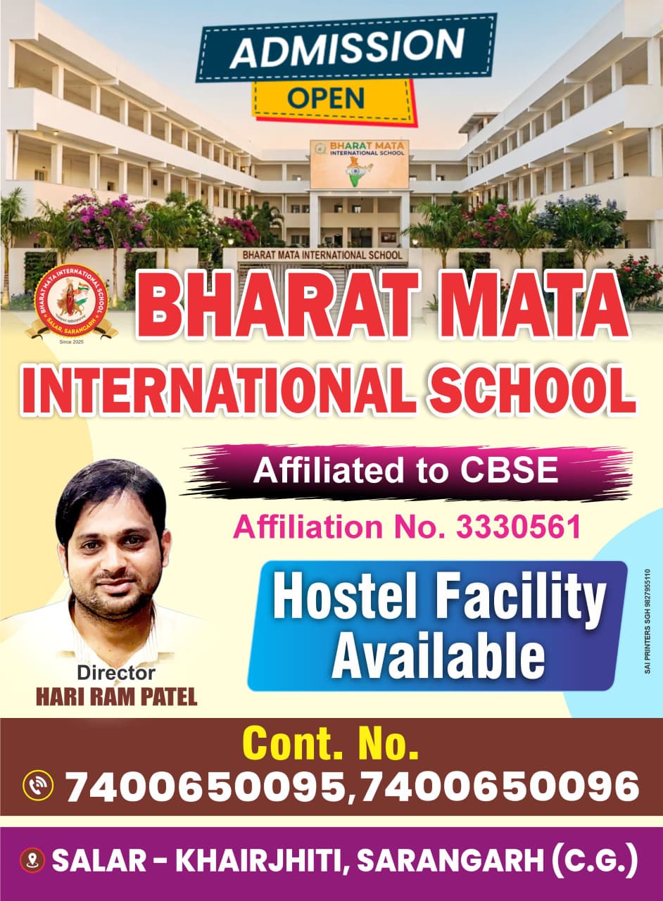 Bharat Mata Hr. Sec. School, Salar , Dist - Sarangarh, C.G.,Sarangarh, was established in the year of 2025-26 with an objective ofproviding quality education to the children of all the sections of society. Theschool is affiliated to the Chhattisgarh Madhyamik Shiksha Mandal Raipur. Italso houses, an English Medium Middle school at Industrial Area Sarangarh .